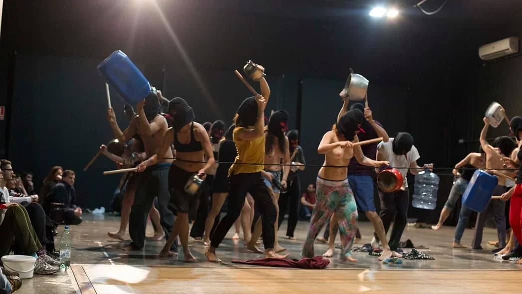 Batucada simboliza um desfile triunfante e revolucionário, onde insurgentes mascarados batem em panelas, frigideiras e latas num ritual que anula fronteiras entre espectadores e artistas.