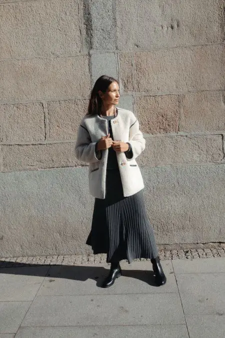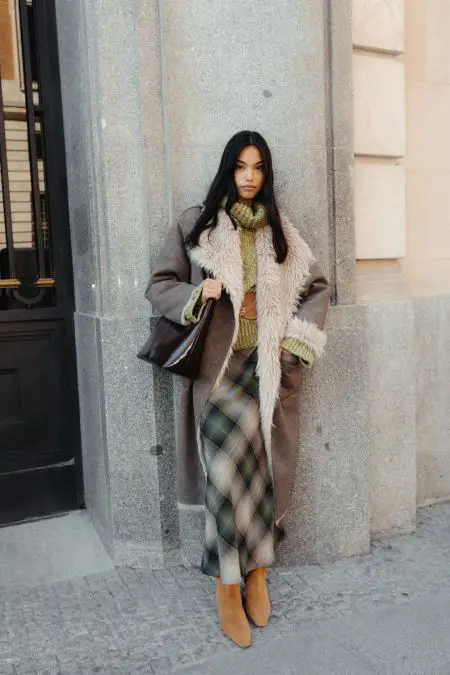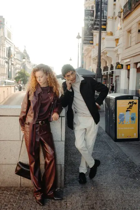 Feminina: malhas, denim, coordenados monocromáticos em bordeaux e mostarda, com cortes contemporâneos e detalhes acetinados.