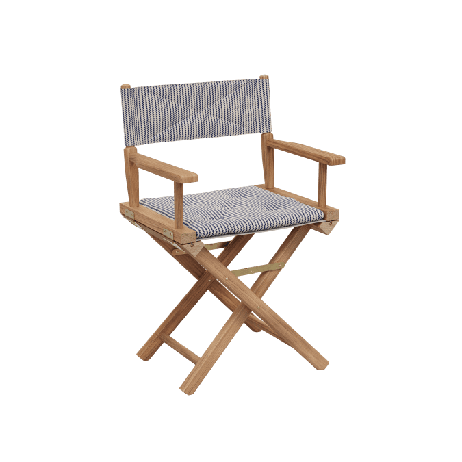 Em teca maciça certificada FSC, ferragens em latão e tecidos preparados para enfrentar sol, vento e vida, a cadeira apresenta-se em duas peles distintas: