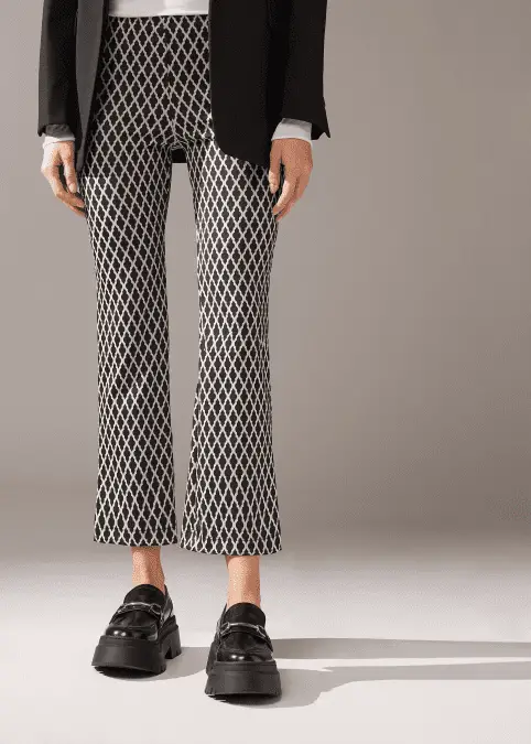 Há uma escolha colorida de leggings flare e mini-flare, que combinam estampados geométricos com fios de glitter, com funcionalidade e o charme ao original estilo Calzedonia.