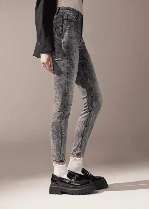 Jeans Elásticos com Efeito Laminado, em azul, 49,95€. na Calzedonia. Foto DR