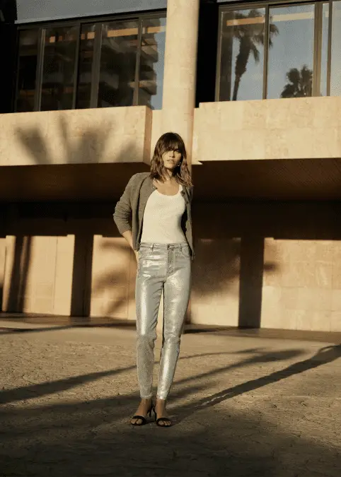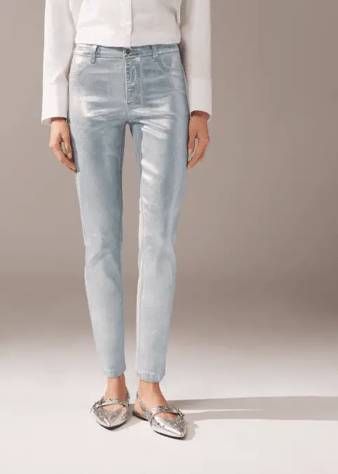Jeans Elásticos com Efeito Laminado, branco prateado, 49,95€, na Calzedonia. Foto DR