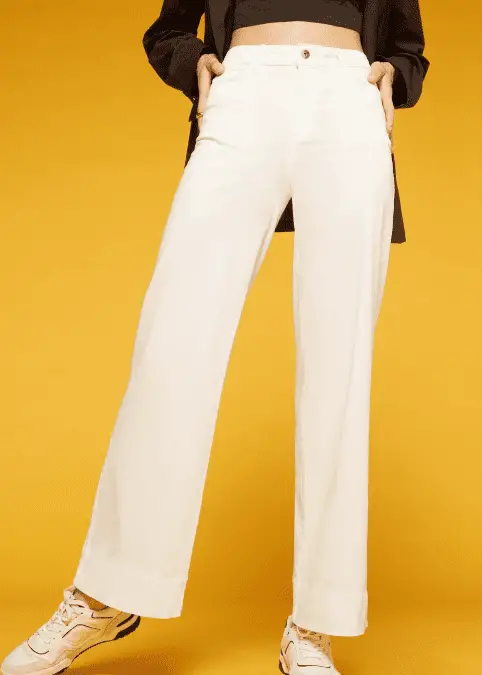 Os jeans push-up, em cinzento, creme e sálvia (verde acinzentado) são acompanhadas por uma diversidade de modelos ultra modernos, desde os cortes flare ou palazzo às calças skinny de cintura alta e cargo.