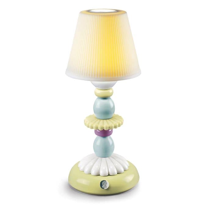 O candeeiro de mesa, sem fio, Lotus, em porcelana fina esmaltada da Coleção Firefly desenhado por Robert Schnyder para a icónica marca espanhola Lladró é composto por fragmentos de porcelana esmaltada decorados com combinação de vernizes de diversas cores. O abajur é em porcelana translúcida branca fosca e as lâmpadas têm um dimmer de metal tátil gravado com o logotipo da flor da marca Lladró para regular a intensidade da luz.