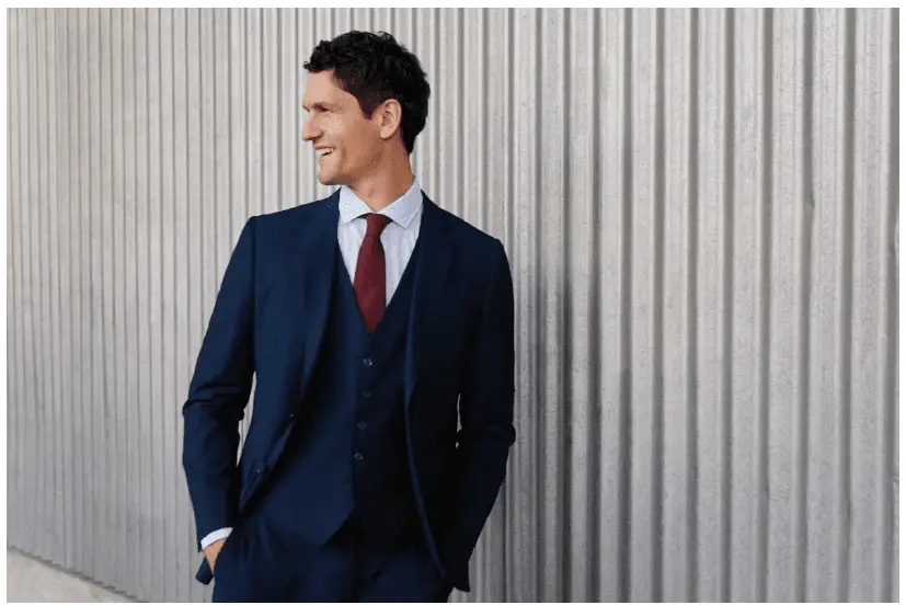 Fato de três peças slim fit com colete em tecido sustentável REPREVE® — elegância com consciência ecológica.