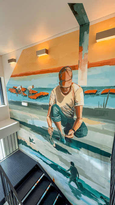 Um mural artístico no interior do hotel, inspirado na Ria Formosa, criado por Edgar Pacheco, cofundador do Estúdio Onze.