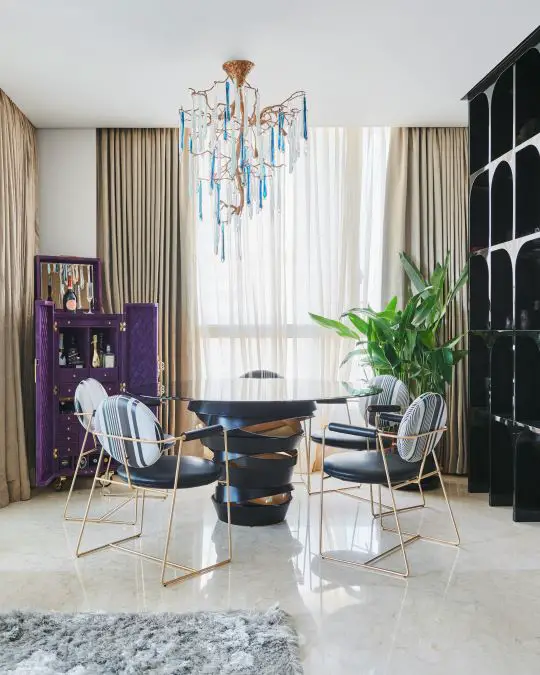 Os móveis e acessórios selecionados são todos provenientes da Europa, das reconhecidas e luxuosas marcas como a Boca Do Lobo, Koket, Tom Dixon, Baxter e Reflex Angelo, combinadas com marcas de luxo locais como a Scarlet Splendor e a Jaipur Rugs, e podem ser vistas desde o momento em que alguém passa pela porta da frente.