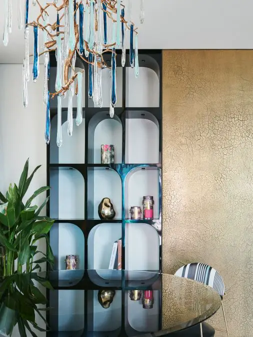 A residência é rica em diversos detalhes e vários elementos sofisticados. Na área de estar principal, rodeada de acessórios luxuosos, e ao lado de uma varanda aconchegante, há um aparelho de televisão escondido em uma estante primária. A estante é o elemento marcante do espaço, com sua fachada de latão texturizado sob medida, projetada para se destacar das prateleiras de ébano em meio arco atrás dela.