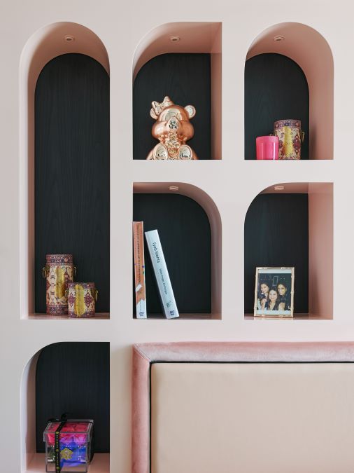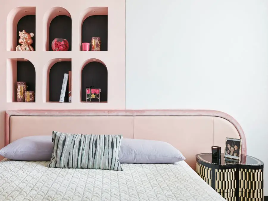 No quarto de hóspedes, o arco apresenta-se dentro da madeira de teca e todos os armários de vidro pintado de preto. E o laço reaparece na suíte master dentro da estante rosa atrás da cama. Nota importante: os três quartos originais foram desmontados e convertidos em apenas duas suítes com layouts bastante generosos.
