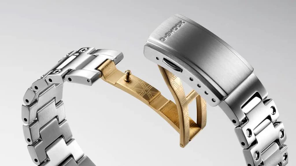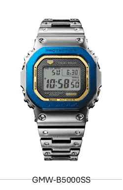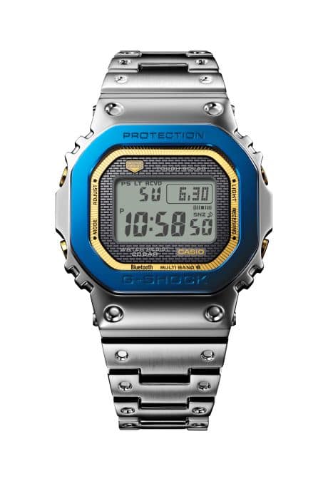 Este novo relógio é concebido com base no GMW-B5000, que apresenta a forma singular do primeiro G-SHOCK de sempre em metal. O design inclue cores de destaque em azul e dourado e um padrão vertical canelado à volta do mostrador que presta homenagem ao Casiotron QW02 original.