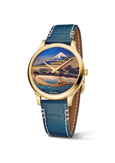 L.U.C XP Urushi Ukiyo-e Retrata o Monte Fuji com técnica maki-e. Homenagem ao mestre Hokusai. Caixa em ouro amarelo ético.