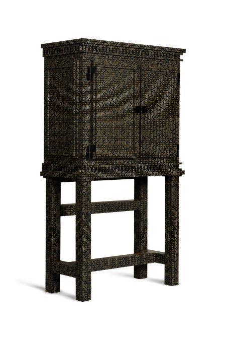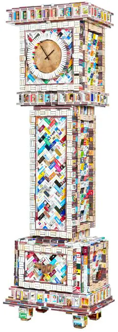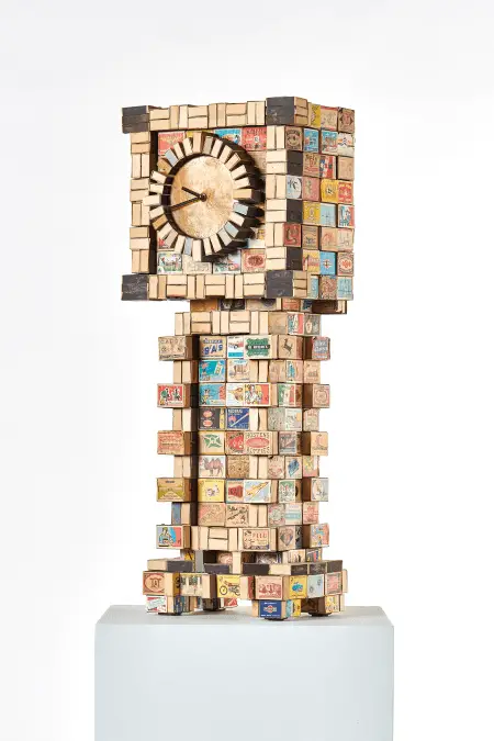 Relógio de caixa de fósforos. Edição 7+2 AP. Dimensão: altura 190 x largura 65 x profundidade 46 cm. Material: caixas de fósforos, madeira, relógio de quartzo, mostrador e alça de bronze.