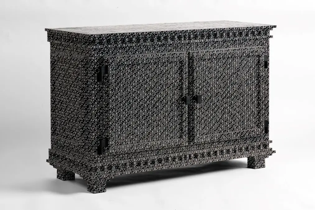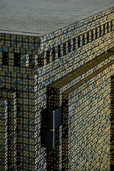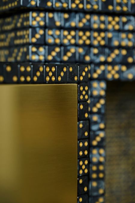 Lucky Dice inclui peças como o armário, castiçal, cômoda, espelho, mesa de jantar, mesa lateral e vaso, fabricados em resina, madeira, latão, espelho.