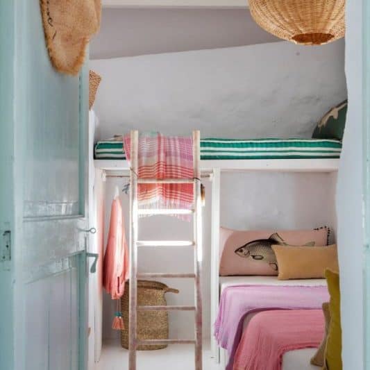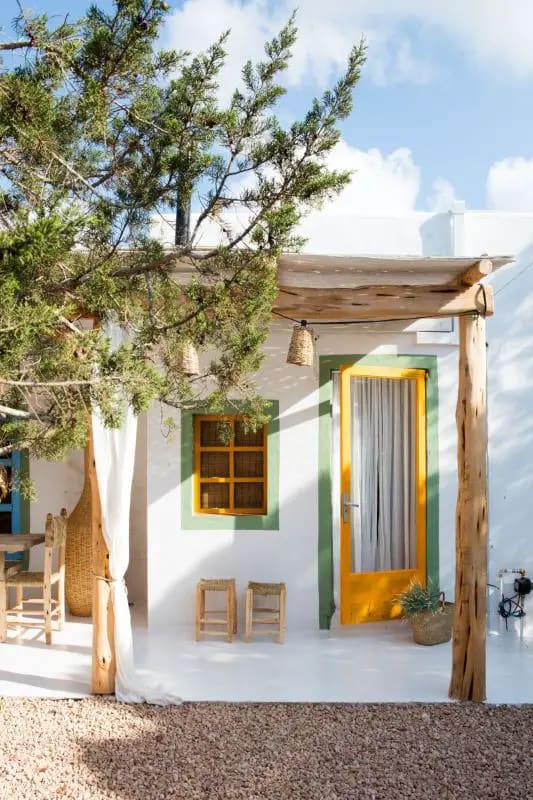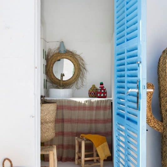 O chapéu Macarella, de folha de palmeira , trançado à mão, peça que simboliza “vamos fazer uma pausa” e que deu origem ao logotipo da marca, não poderia faltar neste recando tão característico, como podemos observar na porta do quarto. A casa de banho, no exterior, é decorada com um espelho Catalina, muito original e tamboretes Ponza.