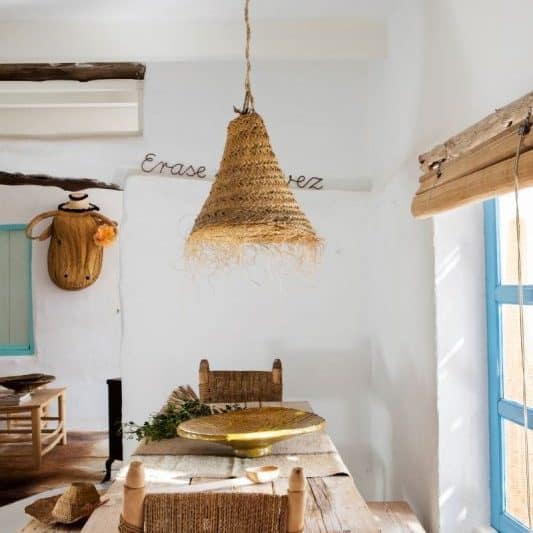Na sala de jantar, o candeeiro de teto Barbaria, feito em esparta, seguindo a técnica do capacho preside a mesa e na sala temos a mesa de centro Bajadilla, sendo a decoração completada com as almofadas da marca Bona Nit.