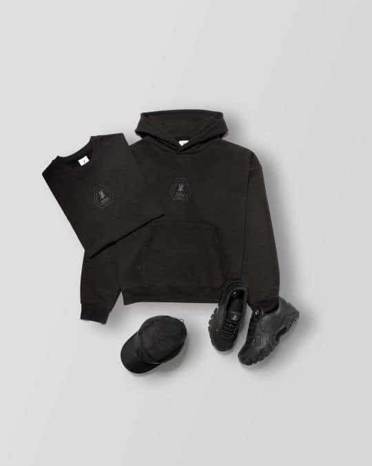 A coleção de design inspirado em uniformes, com peças básicas reinventadas a partir do streetwear, inclui camisola com capuz, t-shirt e boné, todos com um logotipo exclusivo da colaboração, em materiais de alta qualidade e estética utilitária sofisticada.