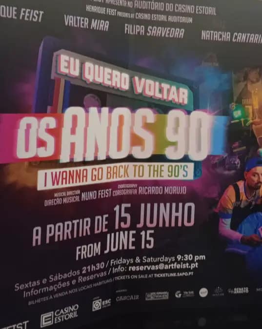 O musical “Eu Quero Voltar – Os Anos 90” teve a antestreia agendada no passado dia 14 de Junho, pelas 21h30, no Auditório do Casino Estoril. A peça vai permanecer no Auditório do Casino Estoril até ao fim do mês de Agosto com representações às Sextas-Feiras e Sábados às 21h30.