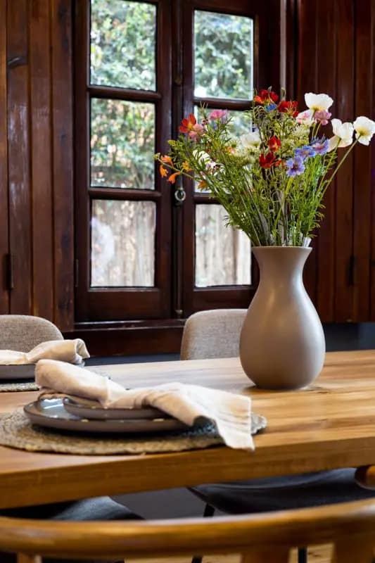 Pormenor de Mesa de jantar com elementos florais. Foto Paula Alveno