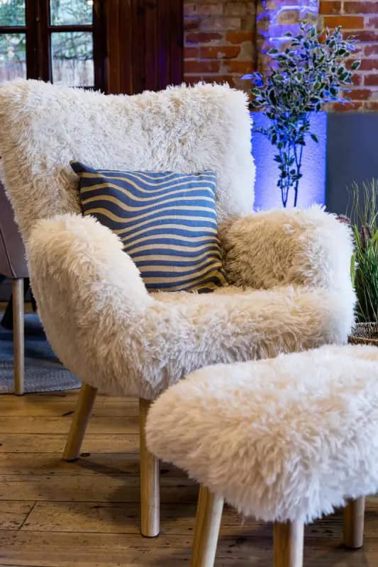 Cadeirão com repousa-pés teddy branco/natural. Foto Paula Alveno