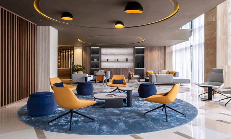 Lobby e Le Méridien Hub, um espaço dinâmico e acolhedor, com iluminação cenográfica e elementos inspirados na mashrabiya tradicional.