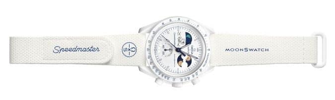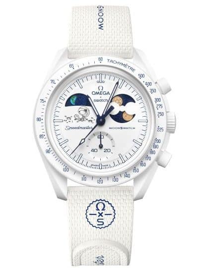 - Logótipos OMEGA X Swatch no mostrador e coroa.
