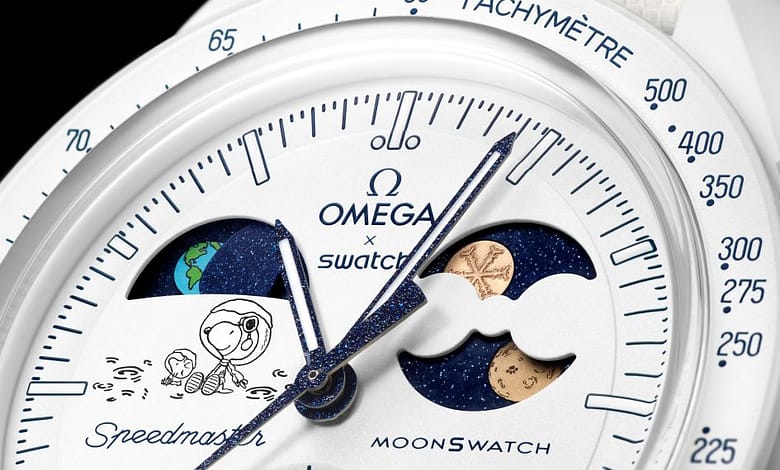 Os detalhes especiais são: indicador das fases da lua com discos revestidos a Moonshine™ Gold da OMEGA, ilustrações Snoopy adaptadas com toque de neve, ponteiros e marcadores com Super-LumiNova® Classe A (emissão verde) e luneta taquimétrica com marcadores em azul-marinho.