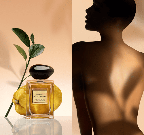 Com 25% de concentração, a fragrância mantém uma assinatura marcante e duradoura, refletida no frasco icónico Armani/Privé — vidro transparente tingido de laranja radiante, placa dourada polida, estética depurada.