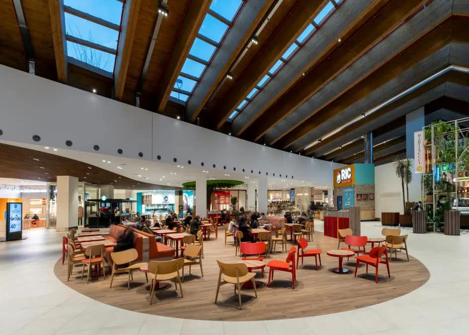 A iluminação de shopping, semelhante à iluminação de lojas, é uma experiência completa! Basta dar uma volta pelo centro da cidade e observar a iluminação dos showrooms para ver como ela pode realçar a arquitetura e o design das lojas e torná-las mais atraentes para os clientes, incentivando-os a permanecer mais tempo dentro e fazer compras. Também seguimos esses princípios na Merlata, nos esforçando para criar um ambiente acolhedor, fluido e envolvente no qual os visitantes pudessem ter uma experiência agradável e passar um tempo de qualidade. Seja olhando vitrines, comendo ou socializando, a iluminação deve ser discreta e não “gritar”, mas sim contribuir para uma experiência alegre. Adotamos várias soluções para eliminar o brilho produzido por fontes de LED, usando acessórios antirreflexo e, em alguns casos, projetando luminárias antirreflexo especiais. Além disso, prestamos muita atenção à qualidade da luz, garantindo que ela fosse muito alta para evitar problemas ópticos e fornecer iluminação agradável e confortável.