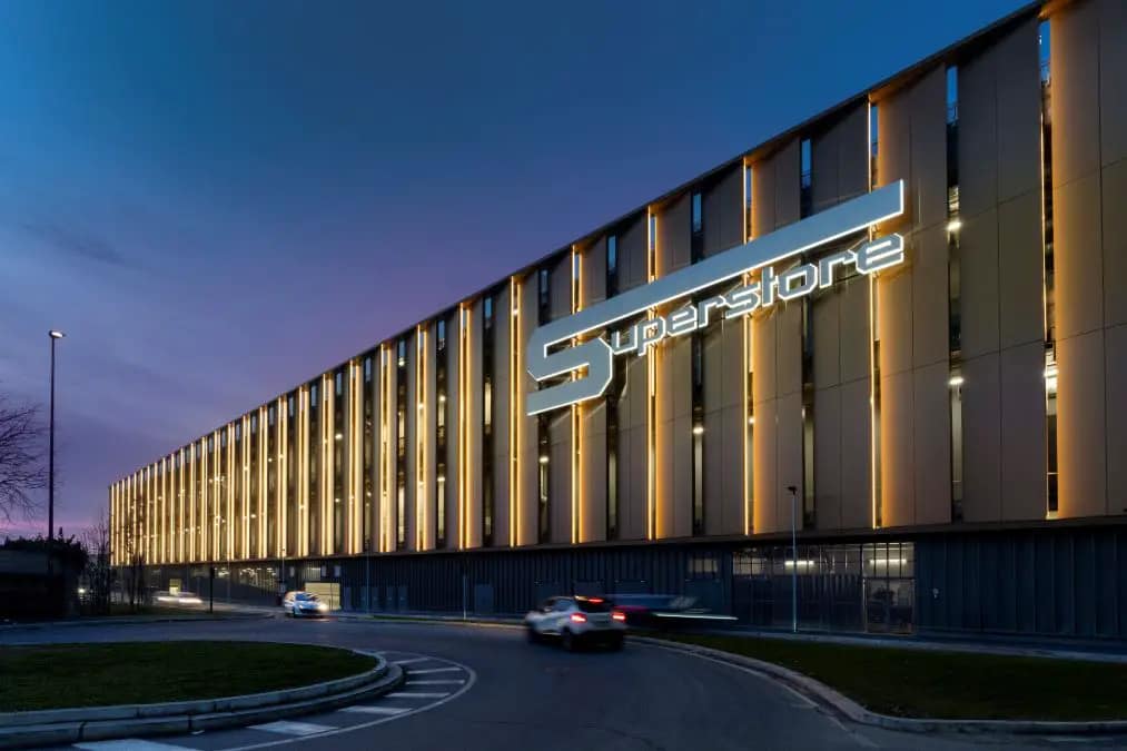 É um projeto que se desenvolveu em uma área urbana com um forte passado industrial e está se definindo cada vez mais como um novo centro de interesse para Milão. Visto de cima, com seus dois blocos elípticos unidos por uma conexão suspensa em forma de ponte, o complexo Merlata Bloom lembra a estrutura helicoidal do DNA. E, de certa forma, é como se o DNA “vibrante” de Milão tivesse sido estendido para o que antes eram áreas urbanas marginais. Localizado perto de uma grande rede de rodovias, do centro de exposições e de uma área residencial recém-desenvolvida, o Merlata Bloom é o ponto focal deste novo centro urbano, com sua arquitetura orgânica atraente. Suas fachadas são projetadas para aprimorar a experiência visual de perto e de longe, tanto dos visitantes do shopping quanto dos veículos que transitam pela rodovia. É uma arquitetura que combina harmoniosamente tecnologia avançada e sustentabilidade, na qual o telhado principal é projetado para ser ecologicamente correto e fornecer luz natural abundante sem causar ofuscamento ou superaquecimento, elementos que são tudo menos óbvios. A base do nosso projeto de iluminação foi o briefing inicial fornecido pela equipe de arquitetos da CRTKL e pelo arquiteto-chefe Jorge Beroiz. Nossos conceitos iniciais foram baseados na aparência helicoidal do edifício, que por si só sugeria uma ideia de “dinamismo”, de algo que teria a capacidade de mudar ao longo do dia. Nosso objetivo era oferecer uma percepção diferente para qualquer pessoa que dirigisse pela rodovia: em outras palavras, queríamos criar uma forma dinâmica e não estática com iluminação indireta que se integrasse harmoniosamente com o entorno. Isso realmente teria ajudado a entender completamente a forma escultural do edifício, mas foi aqui que surgiu o primeiro obstáculo: o primeiro conceito também incluía o uso de cores, ou seja, luminárias RGB, às quais a autoridade de transporte se opôs, pois a mudança de cor na fachada, embora lenta na transição, aumentaria o risco de distração por parte dos motoristas que passavam, com o consequente aumento do risco de acidentes no que é um cruzamento muito movimentado. No geral, o monocromático final ainda satisfez a todos. Depois, há a questão da poluição luminosa, um perigo real sempre ao virar da esquina ao lidar com estruturas amplamente envidraçadas como esta. A principal preocupação do nosso estudo foi cumprir com os novos requisitos energéticos e ambientais impostos pelo projeto bioclimático e energético do edifício, tanto para iluminação externa quanto interna, visando ter impacto zero no ambiente circundante, ou seja, poluição luminosa zero e ofuscamento reduzido ao mínimo. Um requisito aqui que é ainda mais importante devido à passagem frequente de aeronaves na aproximação ou decolagem, para as quais a iluminação ascendente certamente teria sido um incômodo nas fases mais delicadas do voo.
