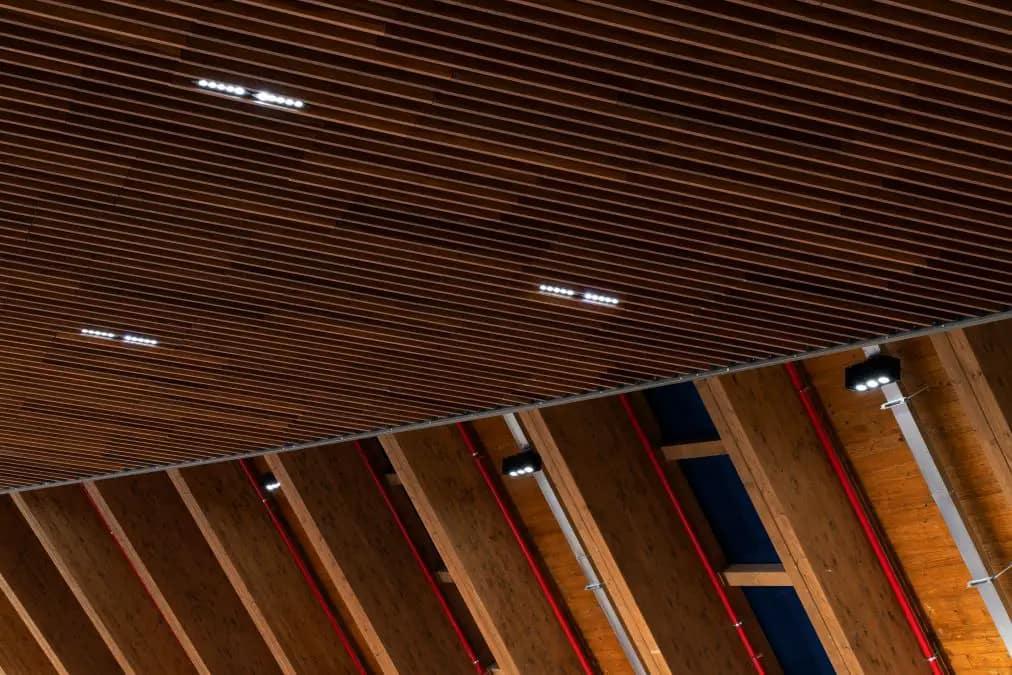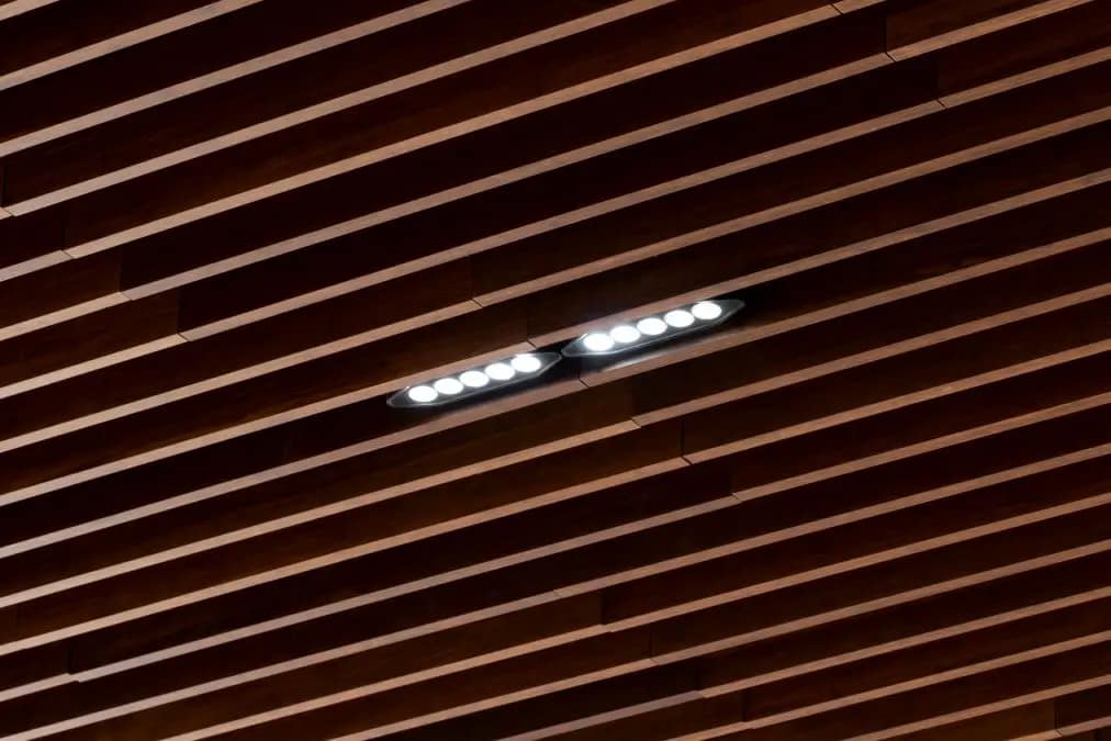 O telhado principal, como mencionado anteriormente, apresentou um desafio arquitetônico e estrutural significativo. Tivemos que encontrar soluções “criativas” para a aplicação de luminárias nos corredores e no átrio. Problemas semelhantes também ocorreram na área do conservatório, onde tivemos que entender completamente e fazer nossa a relação entre as vigas de madeira e o vidro para evitar problemas de poluição ambiental e luminosa. No entanto, os problemas mais complexos estavam relacionados à fachada e à iluminação externa. Para a iluminação externa, era essencial cumprir as restrições impostas pelo município, então tivemos que seguir suas recomendações. Para a iluminação da fachada, enfrentamos desafios relacionados às restrições da rodovia, ao formato das aletas verticais e ao orçamento disponível. Apesar dessas dificuldades, conseguimos criar um design arquitetônico e vital muito bonito.