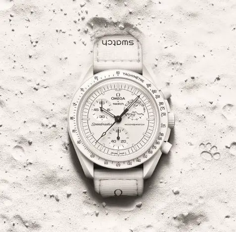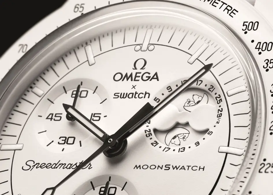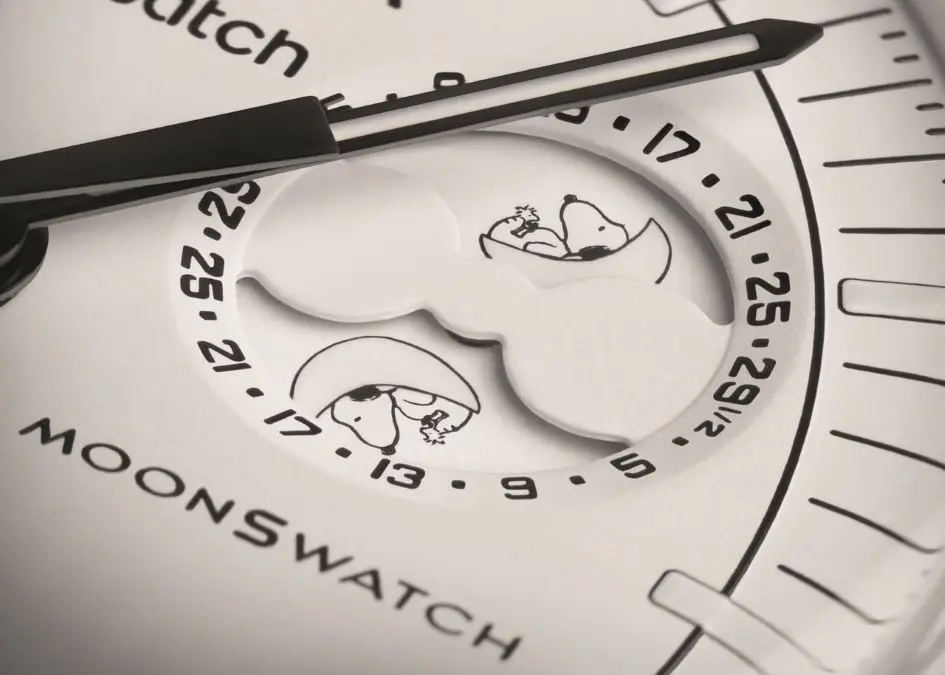 Mostrador: branco, com o logótipo OMEGA X Swatch e os icónicos logótipos Speedmaster e MoonSwatch; submostradores e marcadores de horas embutidos com Super-LumiNova ® de Classe A (emissão verde). Indicador das fases da lua com máscara branca e disco das fases da lua com o Snoopy, a mascote da NASA, e o Woodstock deitados na lua. Detalhe secreto em tinta UV (emissão azul) com a famosa citação da banda desenhada do Snoopy, a lua crescente e as estrelas