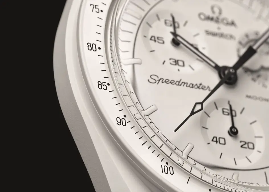 Todas as principais características do Speedmaster Moonwatch original, o primeiro relógio a ir à Lua, podem ser encontradas no Bioceramic MoonSwatch MISSION TO THE MOONPHASE: a caixa assimétrica, a famosa luneta com escala taquimétrica com o “ponto sobre 90” e os submostradores típicos do Speedmaster.