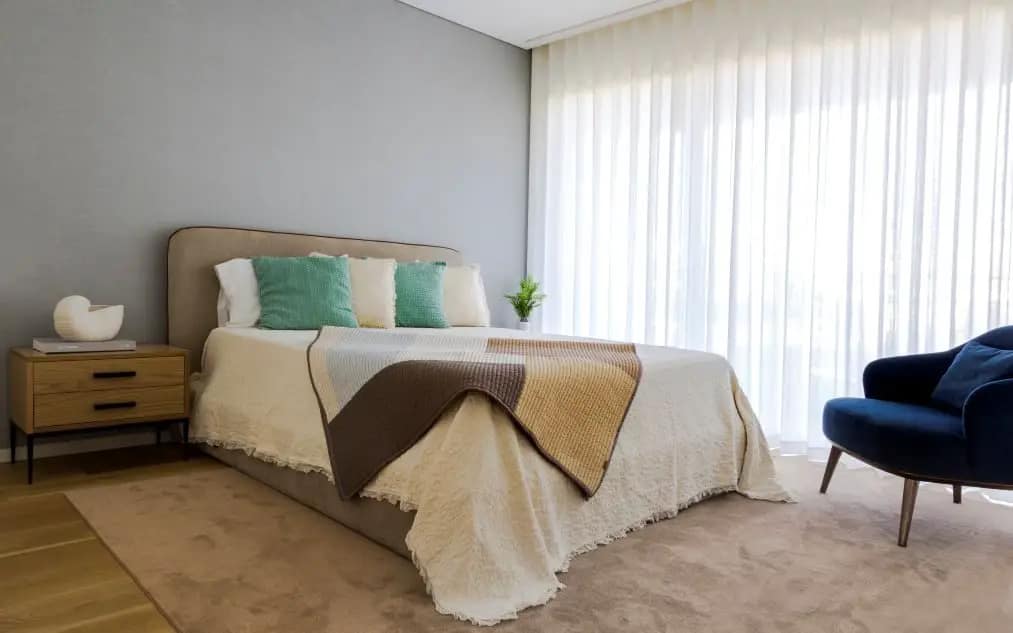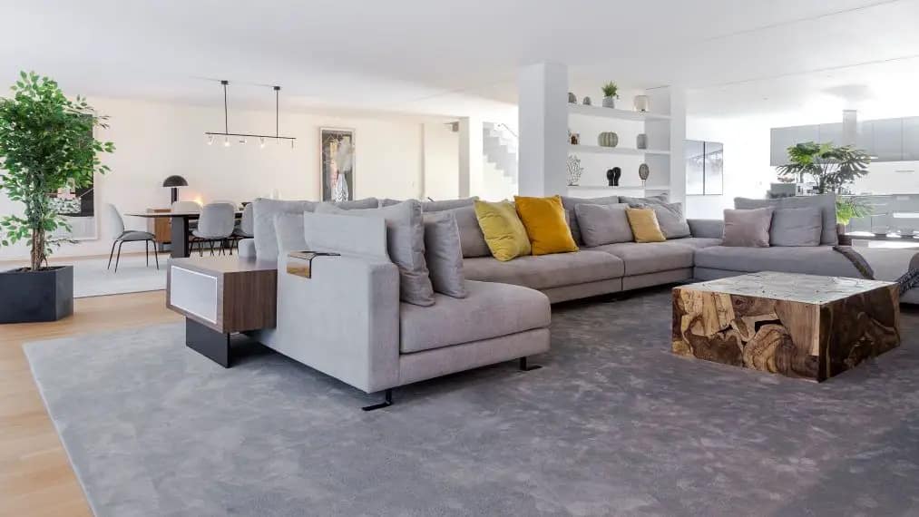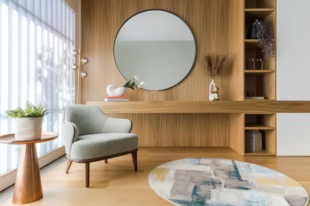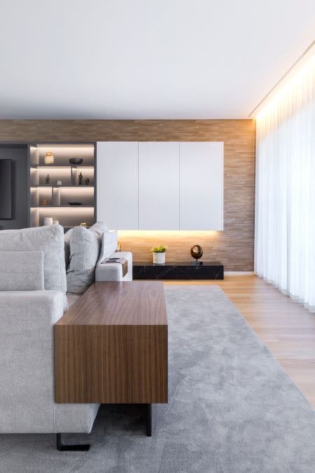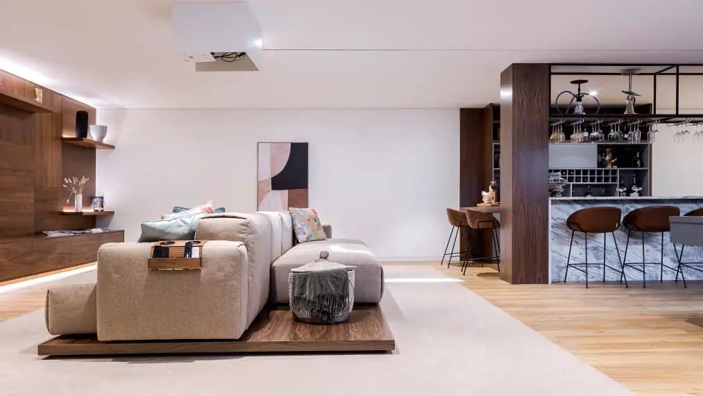 Zona social e de convívio onde as madeiras, os pormenores dos tecidos e os tons naturais se destacam criando um ambiente de grandeza e elegância.