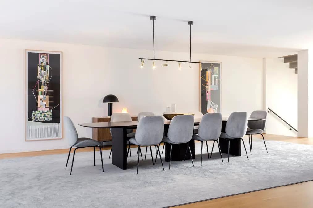 O espaço generoso e comum da sala de estar e sala de jantar, apresenta uma gama de cores natural com traços de tons ricos e acabamentos personalizados.
