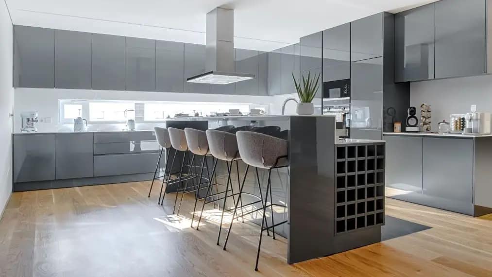 A cozinha, com ilha, um ambiente com personalidade, em tons de cinzento que transmite serenidade e projetada para cozinhar alimentos e poder em simultâneo reunir família e amigos para as refeições.