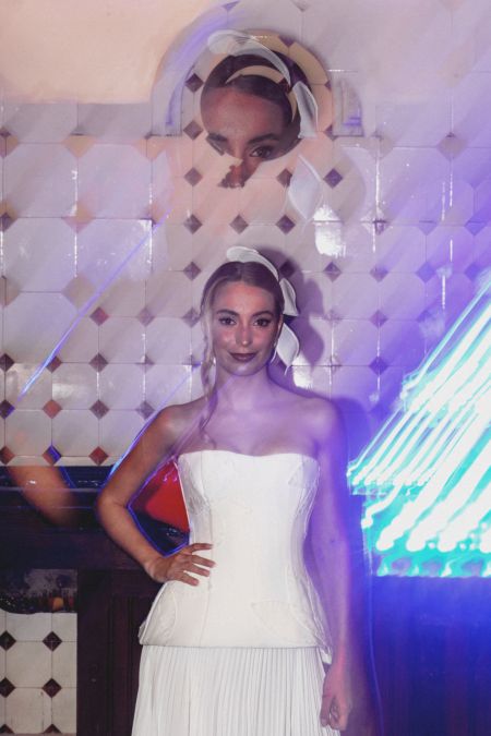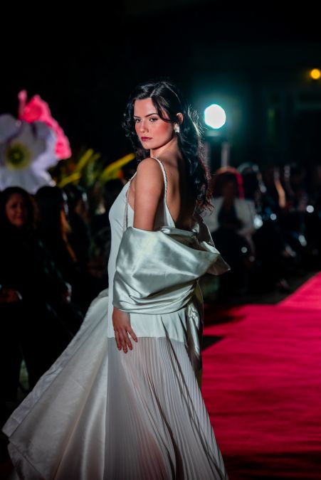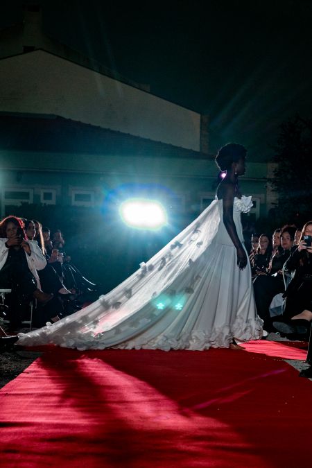 Morena Andrade abriu o LUX.manifesto com uma proposta que ultrapassa o desfile tradicional: uma instalação performativa de noivas, distribuídas pelas cocheiras do Pestana Palace, cada uma ocupando a sua “box” como se fosse um altar íntimo. A criadora brasileira transformou o espaço num corredor de emoções suspensas, onde cada figura representava um estado de passagem — da inocência ao renascimento, da expectativa à luz.