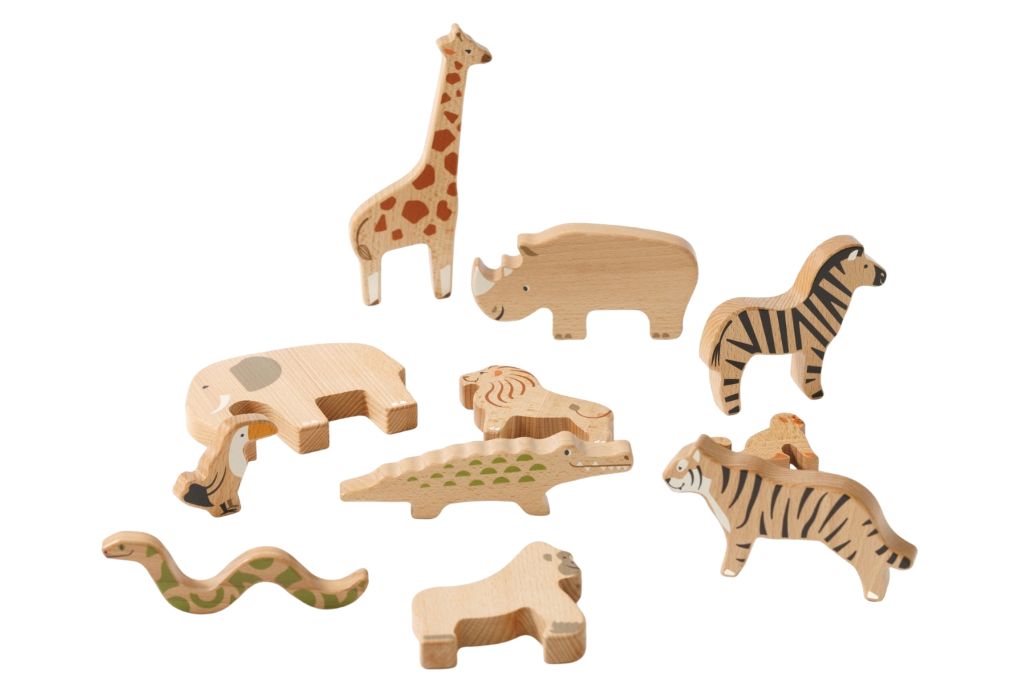 Feitos com madeira maciça de florestas sustentáveis, os brinquedos combinam simplicidade e beleza: