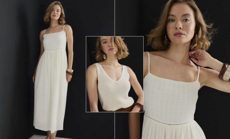 As peças apresentam tecidos naturais como algodão e linho, detalhes artesanais, cortes descontraídos e materiais leves que transmitem movimento e liberdade