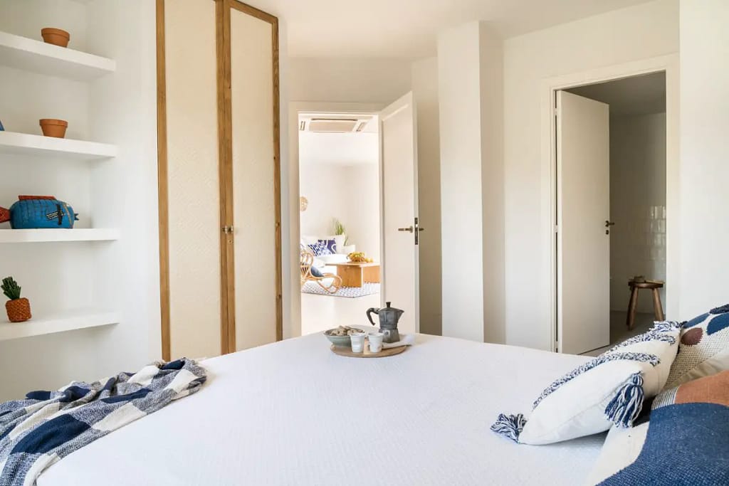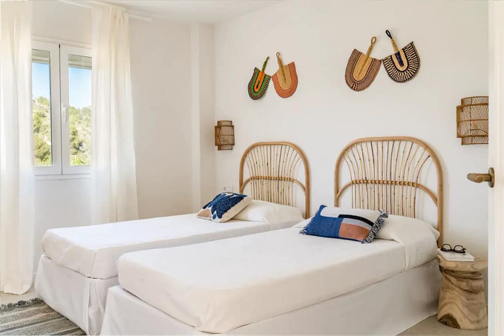 O quarto principal tem três grandes roupeiros à medida, com portas de carvalho revestidas a ráfia, tal como a cabeceira da cama de casal. Ambos os quartos são decorados com artesanato africano e da Sardenha.