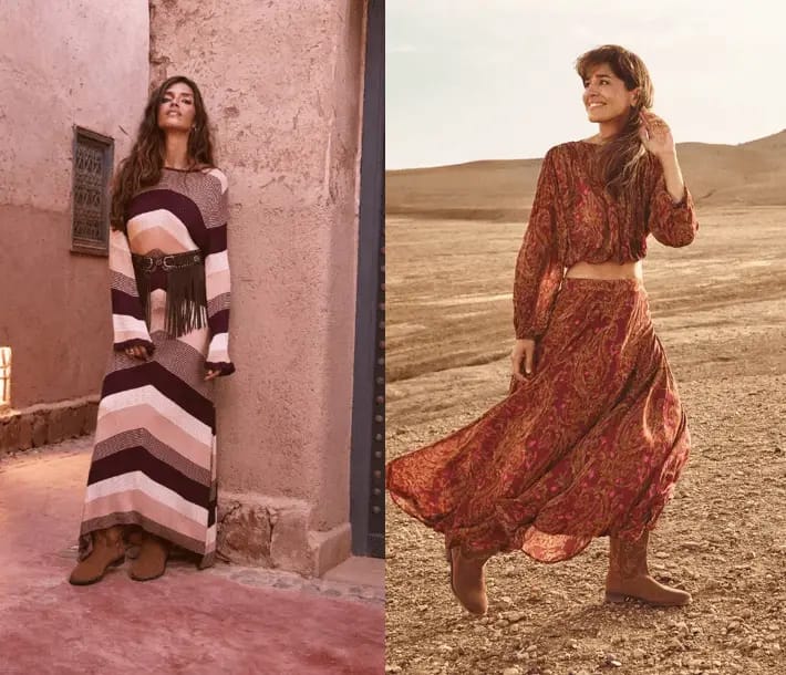 Franjas e estampados que acompanham cada passo com alma boémia.