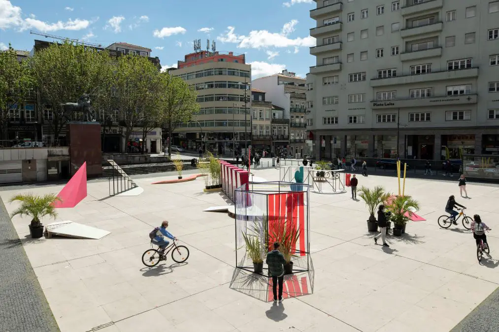 Componentes como cobogós, rampas, curvas dos jardins e estruturas fundamentais compõem um circuito de bicicletas ao ar livre que oferecem uma instalação singular e envolvente.