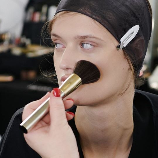 Para marcar o contorno do rosto foram aplicados os batons Prada Momochrome soft matte e o conjunto de cores de maquilhagem de olhos Prada Dimensions Pure 05, foram utilizados para iluminar as maçãs do rosto, o “V” do lábio superior e a zona da clavícula.