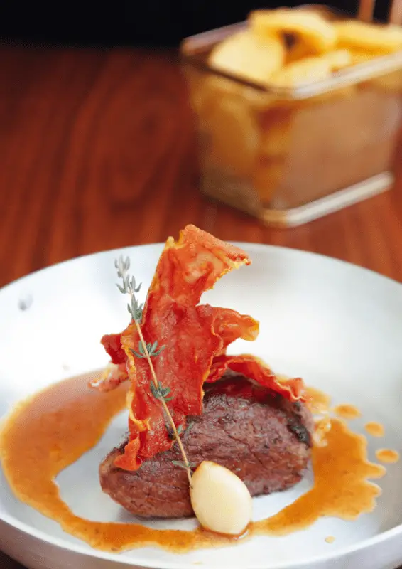 - Pratos principais: bife à portuguesa, polvo grelhado, bacalhau à Brás, chambão assado, lombinhos de porco preto, arroz de caras de bacalhau, tomatada de cogumelos, salada César