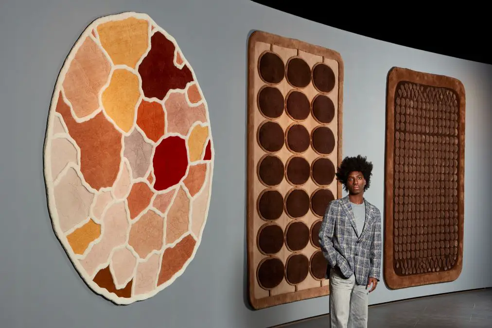 Os tapetes Mursi e Suri (coleção Scarification) e o tapete Dancalia, todos desenhados por Abreham Brioschi, são exibidos no showroom Nodus.
