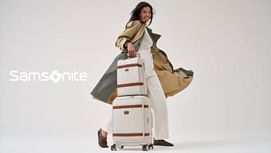 A coleção apresenta malas de viagem, mochilas para portátil e estojos de viagem.