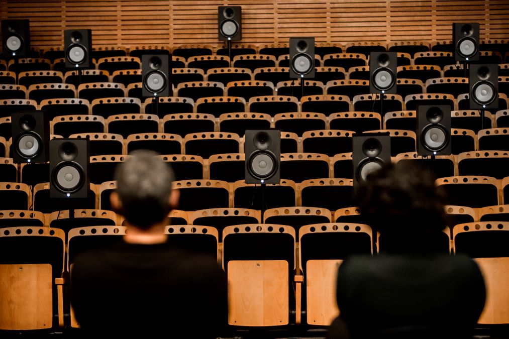 As cerca de vinte colunas negras que se encontram dispostas pela plateia transmitem as histórias de migração pelos próprios migrantes, um Concerto, uma composição sonora de vozes dos que se encontram imperceptiveis e que normalmente não escutamos.
