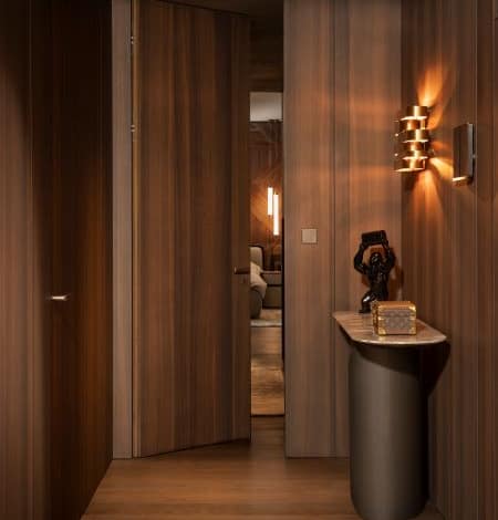 Sempre atentos à utilização de materiais naturais como a madeira e a pedra, os designers abraçaram a visão dos proprietários e criaram um interior requintado dominado por um diálogo harmonioso entre os tons terra e delicados das pedras naturais Antolini® e o calor dos painéis de madeira que cobrem as várias divisões.