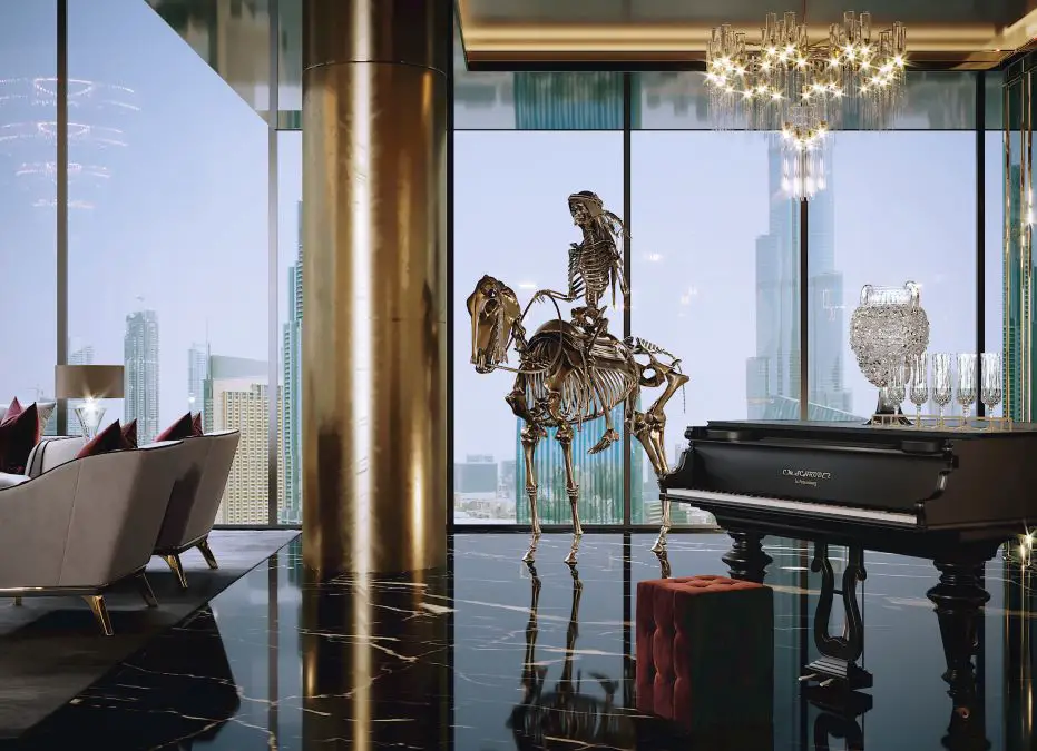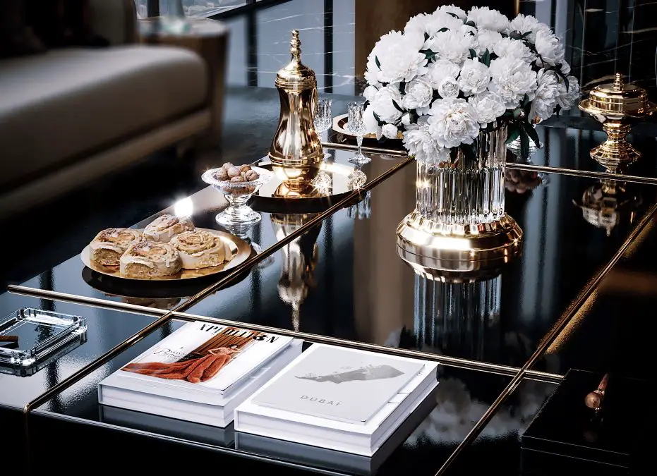 Situado no incrível cenário das paisagens de Dubai, o design de interiores deste apartamento é ideal para um VIP de alto nível. Com uso magnifico de preto e dourado, combina completamente com as exigências do que esperar das particularidades estéticas sofisticadas do design de interiores de Dubai.