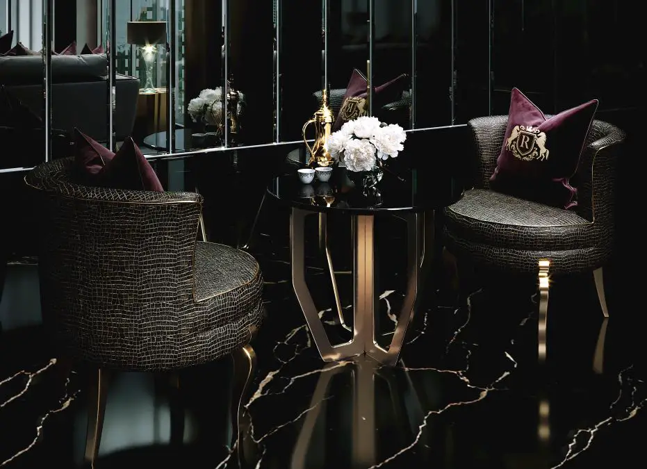 A ideia do cliente era produzir uma exposição muito dramática na área de recepção principal, com um toque ligeiramente masculino, mas com áreas suavizadas para não se sentir muito duro e austero. A designer usou muitos acessórios dourados e texturas para suavizar e, na entrada da recepção principal, criou mesas de luz para exibir a transparência cristalina.