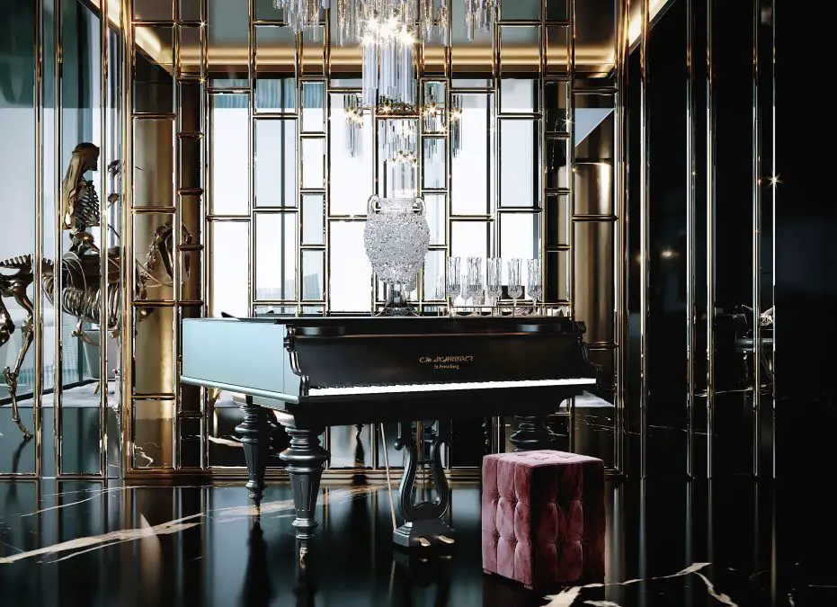 Sobre a iluminação Celia Sawyer salientou: “A iluminação era muito importante e precisava mesmo de exalar luxo e glamour, os lustres e apliques seriam as nossas peças “estrelas”… obras de arte em si. Também espelhei o teto acima da área do piano para que o lustre refletisse criando poças de luz e drama.”